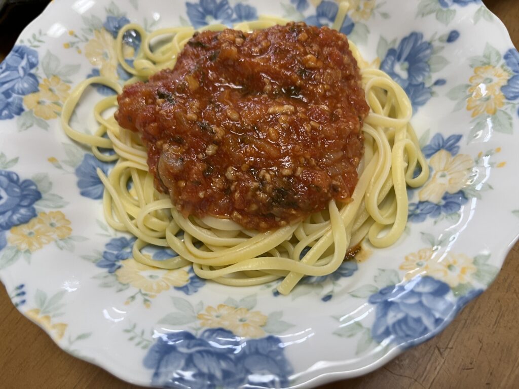 2人分を4人で分けても十分なl量のパスタです。