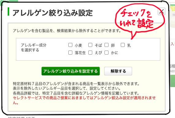 アレルゲン絞り込み」をクリックすると7品目のアレルゲンを選ぶことができるので、のぞきたい食品にチェックを入れて「アレルゲンの絞り込みを設定する」をクリックすると、チェックの入れたアレルゲンのはいっている商品は検索結果に表示されなくなります。
