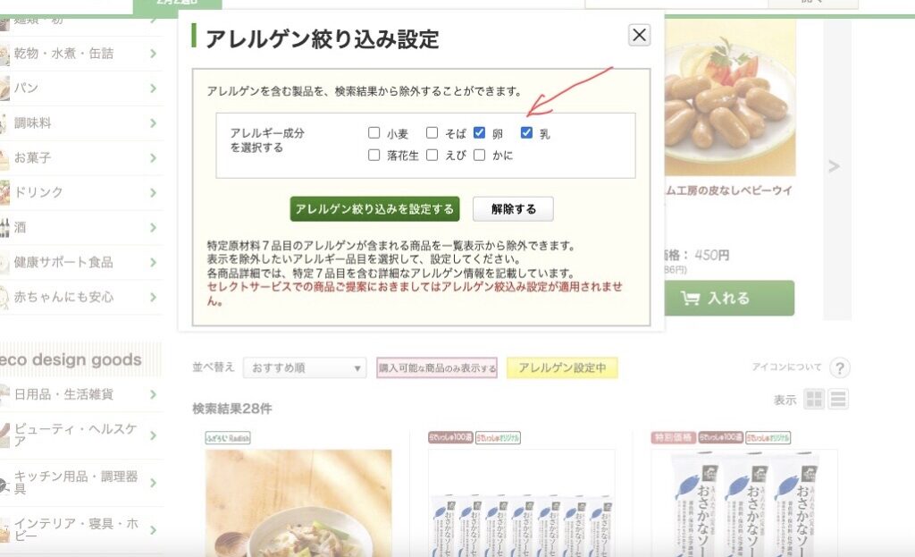 使い方といっても、アレルゲンを選んで「アレルゲン絞込みを設定する」ボタンを押すだけなんですけどね。