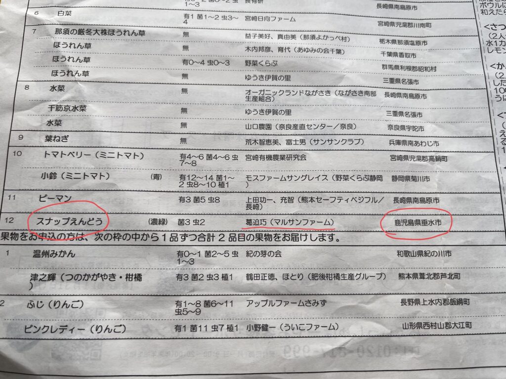 品目、生産地、生産者、農薬などの使用状況をプリントしたものが野菜箱と一緒に届きます。