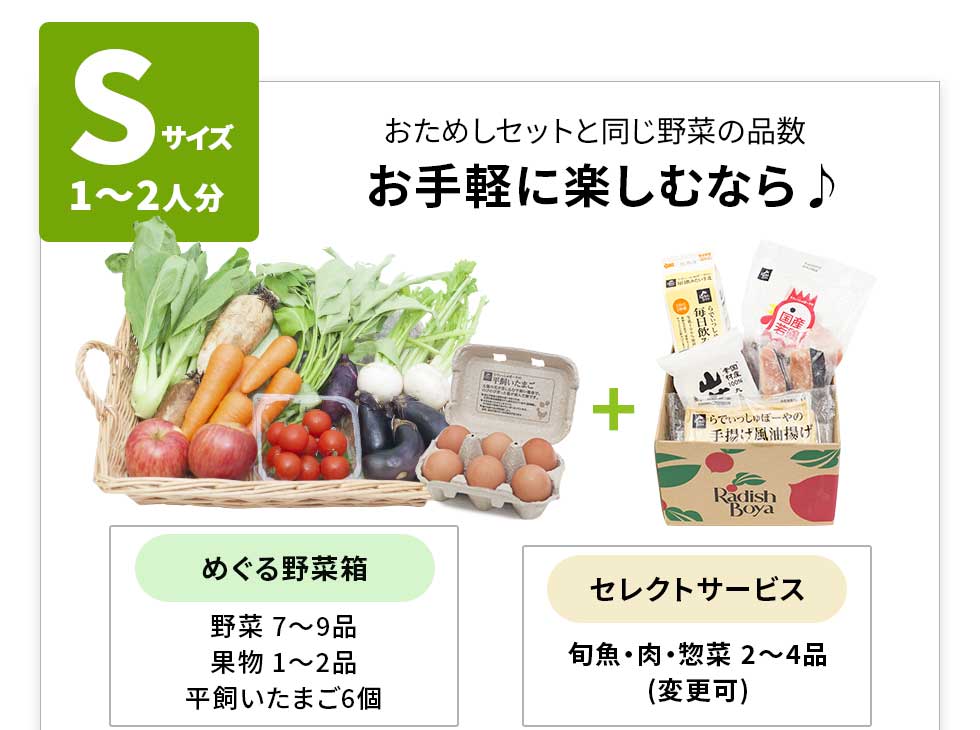 Sサイズ(1〜2人分)のめぐる野菜箱+セレクトサービス(出し入れできる)約2340円として