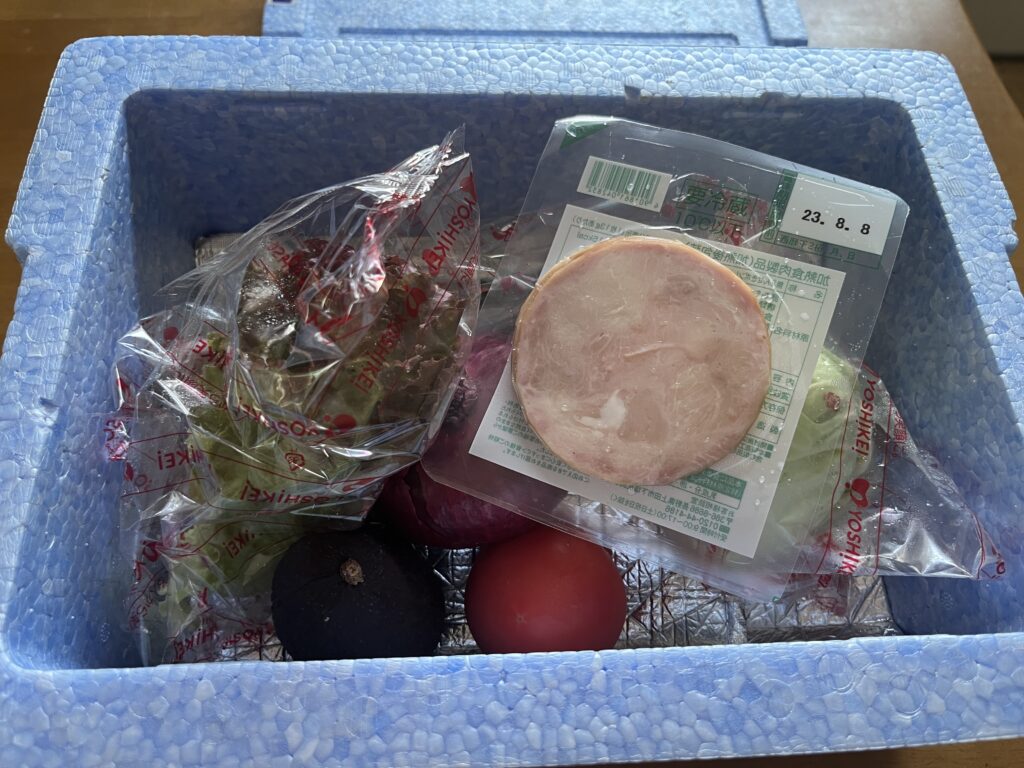 ヨシケイの青い発泡スチロールの箱で届けてくれます。