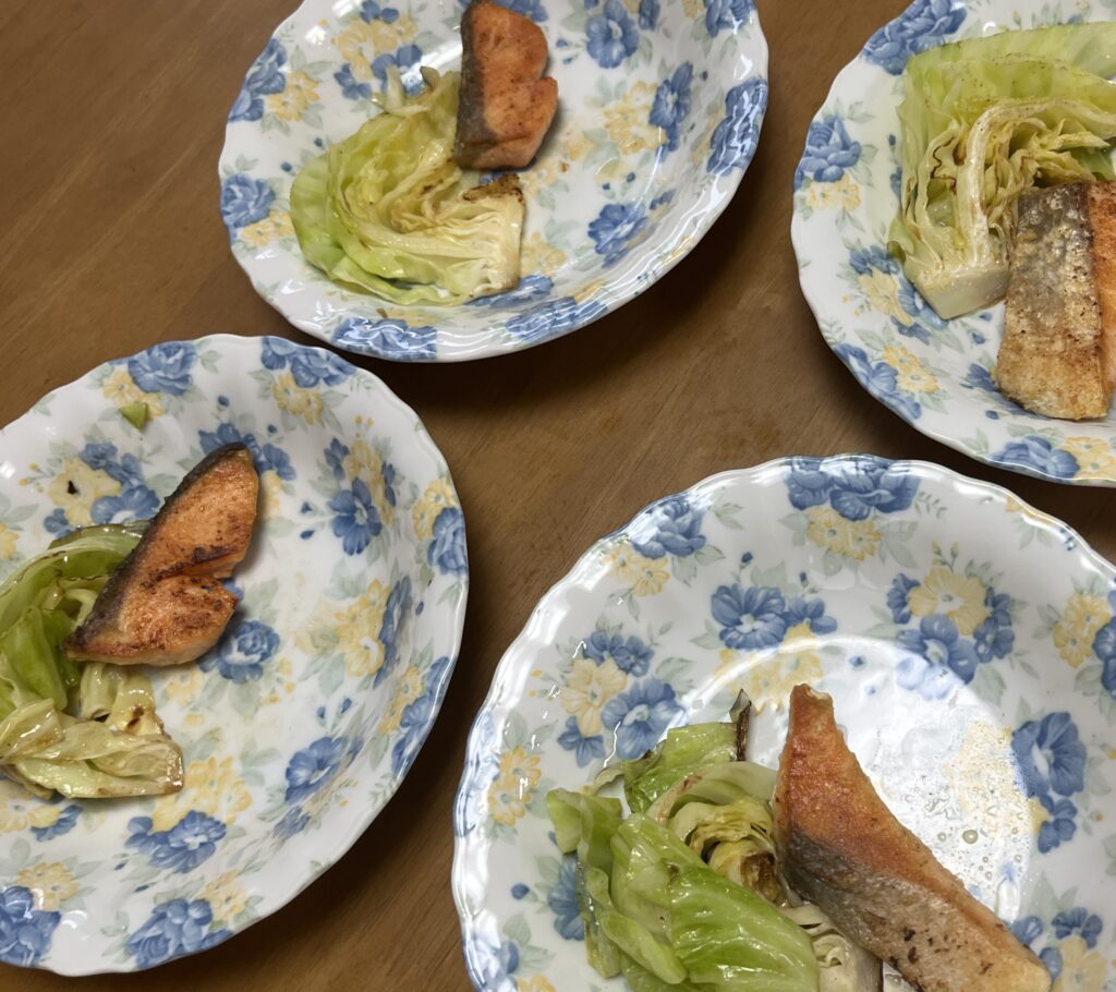 2切れのしゃけを4人分に分けたのでちょっとさみしいので、