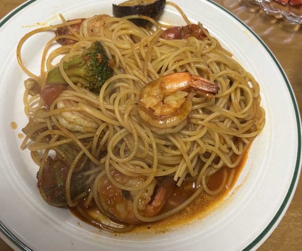 冷凍庫にあったオイシックスの海老のトマトソースでパスタを作ってプラス。